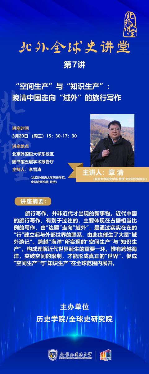 2024年3月20日 在北外图书馆学术报告厅成功举办了《“空间生产”与“知识生产”:晚清中国走向“域外”的旅行写作》的讲座。买球官方网站院长李雪涛教授主持了这场讲座, 首先简单介绍了复旦大学历史学系、文史研究院院长章清教授研究领域及成果,然后大家倾听了章清教授精彩的报告, 最后的互动环节,与会者积极参与讨论,章清教授给予北外的学子们掌握好外语在今后的历史研究领域发挥更大的作用。
