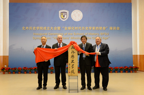 德国国家科学院院士、德国杜塞尔多夫大学原校长腊碧士教授(Alfons Labisch),匈牙利罗兰大学校长薄慕往教授(Borhy László),德国波恩大学汉学系主任廉亚明教授(Ralph Kauz),北外全球史研究院特聘教授顾彬(Wolfgang Kubin),美国夏威夷大学中国研究中心主任刘长江教授(Frederick Lau),奥地利维也纳大学汉学系李夏德教授(Richard Trappl),香港科技大学人文学院院长李中清教授(James Lee),中国社科院世界史所所长张顺洪研究员,中国人民大学买球官方网站院长、长江学者黄兴涛教授,南京大学学衡研究院院长、长江学者孙江教授,北京师范大学买球官方网站分党委书记郭家宏教授,中国科学院自然科学史所所长张柏春研究员,鲁迅文化基金会秘书长周令飞,承德市政协党组副书记王学,中原大地传媒股份有限公司总编辑耿相新,华东师范大学出版社社长王焰,山东大学历史文化学院刘家峰教授,德国马克斯韦伯基金会中国代表处联络人马勊思(Folster Max Jakob),贵阳孔学堂文化传播中心研修部副部长肖立斌教授等嘉宾先后致辞,对北外买球官方网站的成立表示祝贺,希望买球官方网站立足北外的多语种优势,办出特色、办出水平,为中国历史学和世界历史学的发展贡献北外力量。